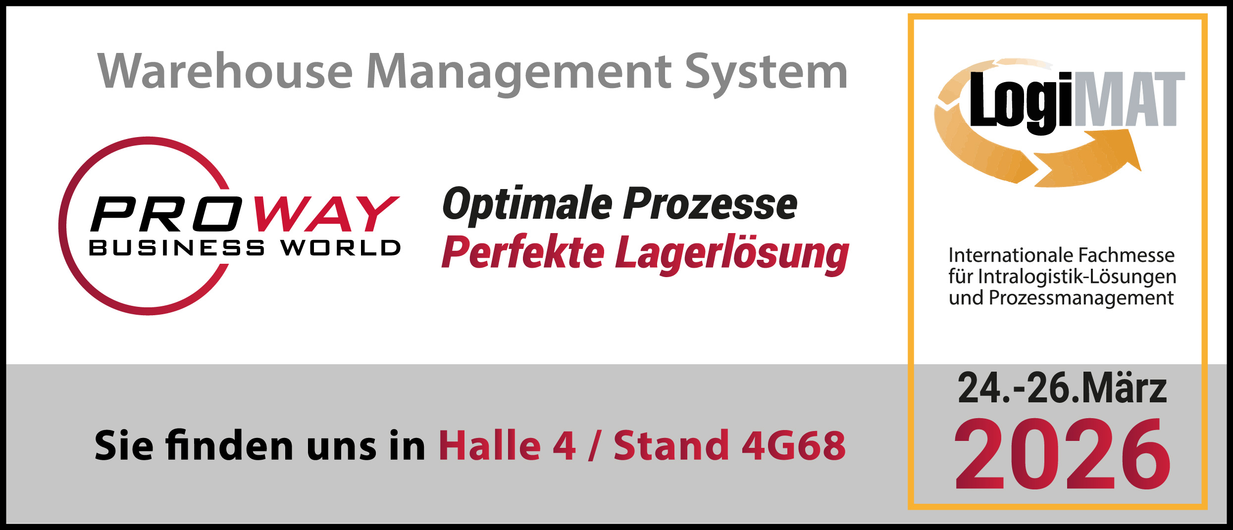 Erleben Sie vom 24. bis 26. März 2026 auf der internationalen Fachmesse für Intralogistik-Lösungen in Stuttgart, wie Sie mit unserem Warehouse Management System Proway Business World Ihre Logistikprozesse effizienter, transparenter und schneller gestalten können. So schaffen Sie die Grundlage für nachhaltige Verbesserungen bei Qualität, Kundenzufriedenheit und wirtschaftlichem Erfolg.