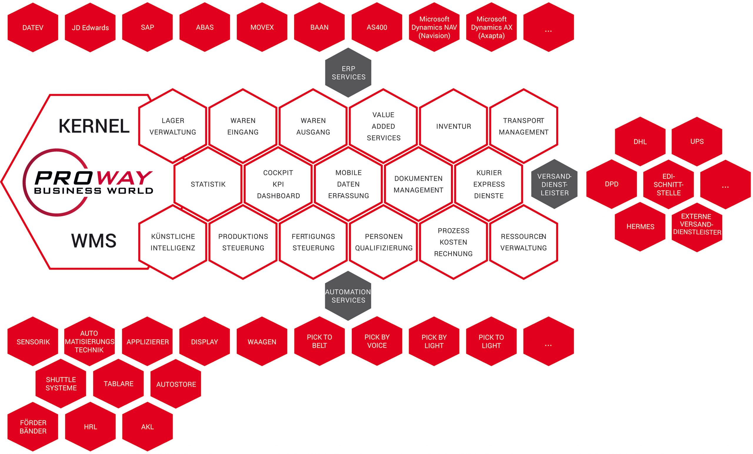 Herzstück einer jeden Logistikanlage ist die Software, die dafür sorgt, dass alle Bereiche, Transporte und Prozesse reibungslos ineinandergreifen. Proway Business World (PBW) ist ein erweitertes WMS mit einzigartigem Funktionsumfang. Im Vergleich zu anderen WMS-Softwarelösungen umfasst PBW nicht nur Standard-WMS-Funktionen, sondern wickelt den kompletten Waren- und Informationsfluss ab. Mit Proway Business World lassen sich sämtliche Waren- und Informationsflüsse entlang der Logistikkette organisieren, steuern, abbilden und in Echtzeit analysieren – auch über verschiedene Logistikstandorte hinweg. Zusätzlich verfügt PBW über Schnittstellen zu ERP-Systemen und einer Vielzahl branchenspezifischer und kundenindividueller Schnittstellen. Dabei unterstützt PBW die Einbindung unterschiedlichster Peripheriegeräte, wie z. B. die Anbindung von Produktionsmaschinen, Waagen, Förderbänder, Roboter und viele weitere.